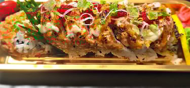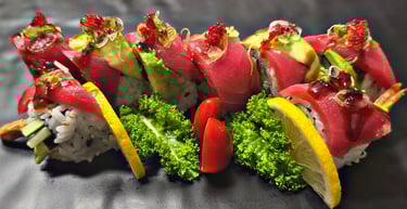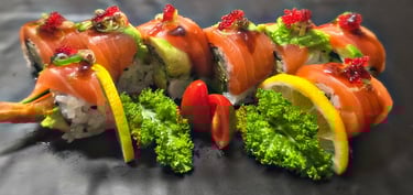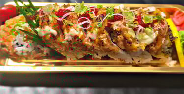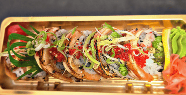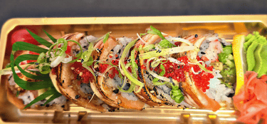 dynamite roll on top with spicy salmon, fish egg, green onion (torched)