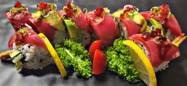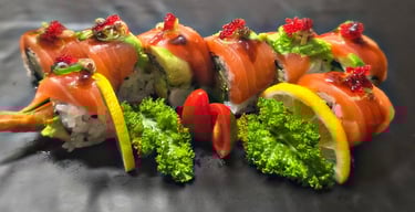 shrimp tempura, avocado, cucumber with salmon, fish egg, green onion on top