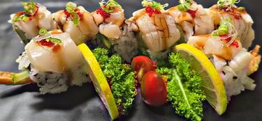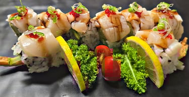 shrimp tempura, avocado, cucumber with scallop, fish egg, green onion on top