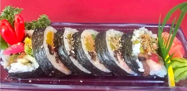shrimp tempura, avocado, cucumber with bbq eel, boiled shrimp, fish egg, green onion on top