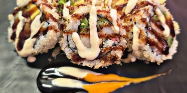 SHRIMP TEMPURA, AVOCADO, CUCUMBER, CRAB MEAT, TEMPURA BITS OUTSIDE